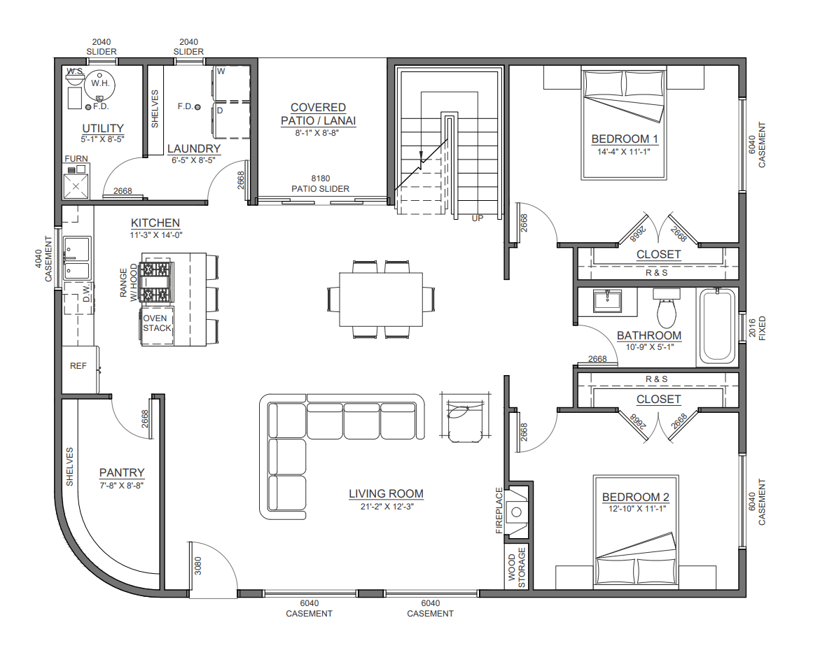 ✔️ Efficient two‑bath layout and practical slab‑on‑grade detailing