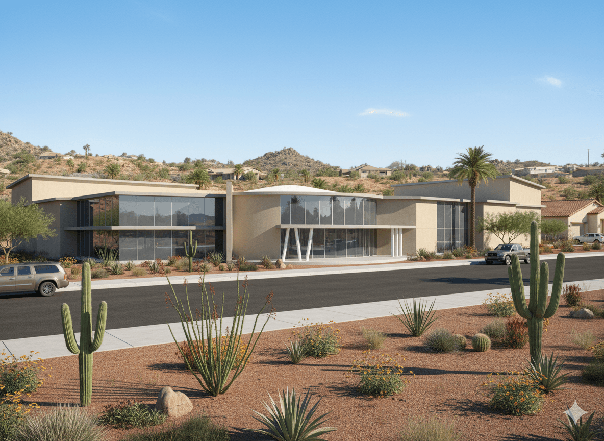 Neutral materials, clean geometry, and drought-friendly landscaping allow the building to blend naturally into a desert environment.