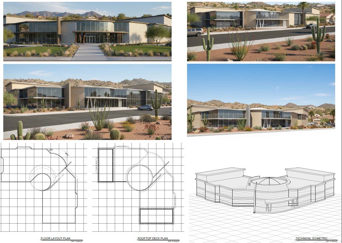 The final deliverables included conceptual plans, elevations, and multiple perspective renderings to illustrate how the building could function within a desert landscape setting.