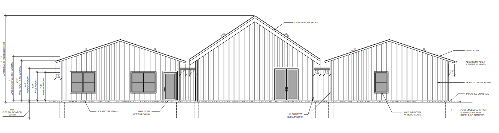 • Center building as the main communal hub with kitchen, living, and dining in a vaulted volume with exposed trusses