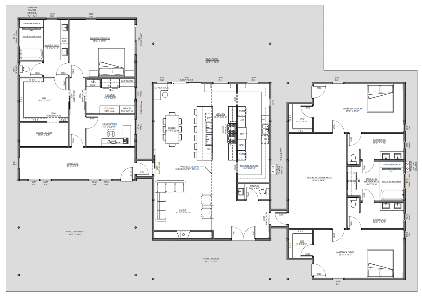 Hearthlark is a custom, single-story barndominium compound built for multi-generational living, using three connected 30-foot-wide buildings to separate private wings from a vaulted central gathering space. Covered porches and a drive patio extend the under-roof footprint, while full MEP planning and future kitchen rough-ins keep the home adaptable. The package is code-focused now and structured for engineering and stamping as a next phase.