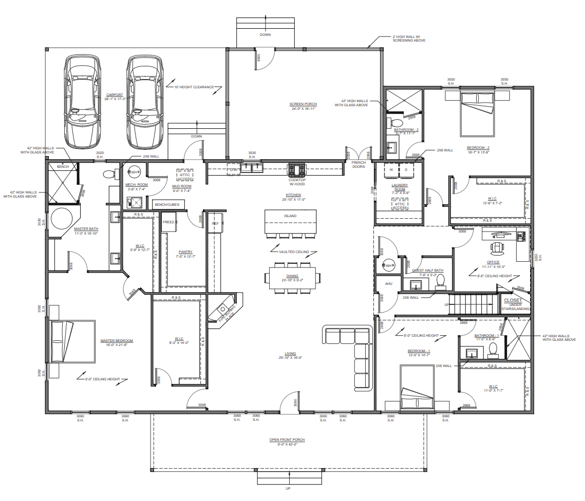 • Define covered-area program under roof, including properly sized carport depth and covered porches, with no enclosed garage