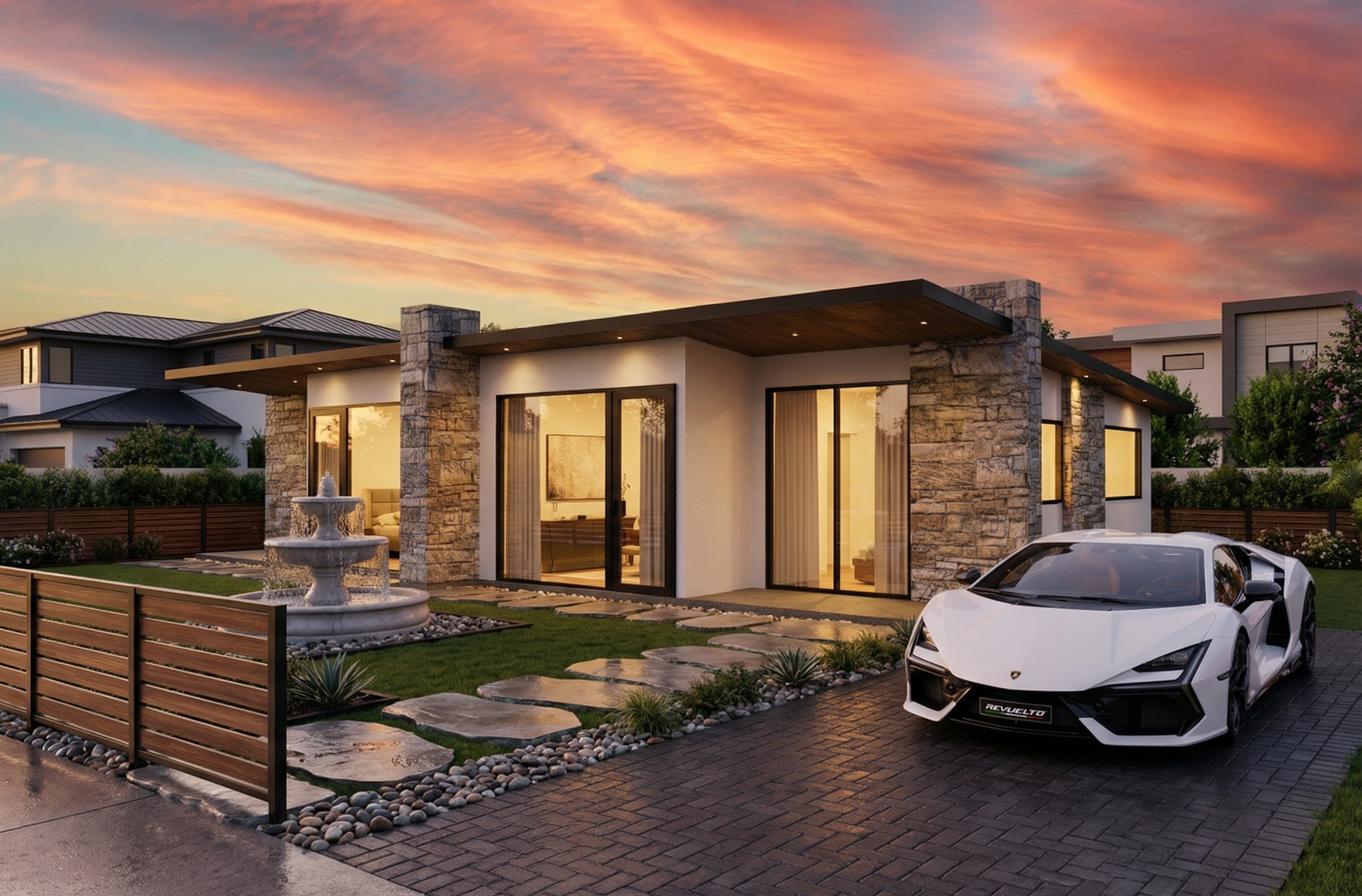 ✔️ Natural sandstone exterior character with interior separation strategy aligned to privacy requirements