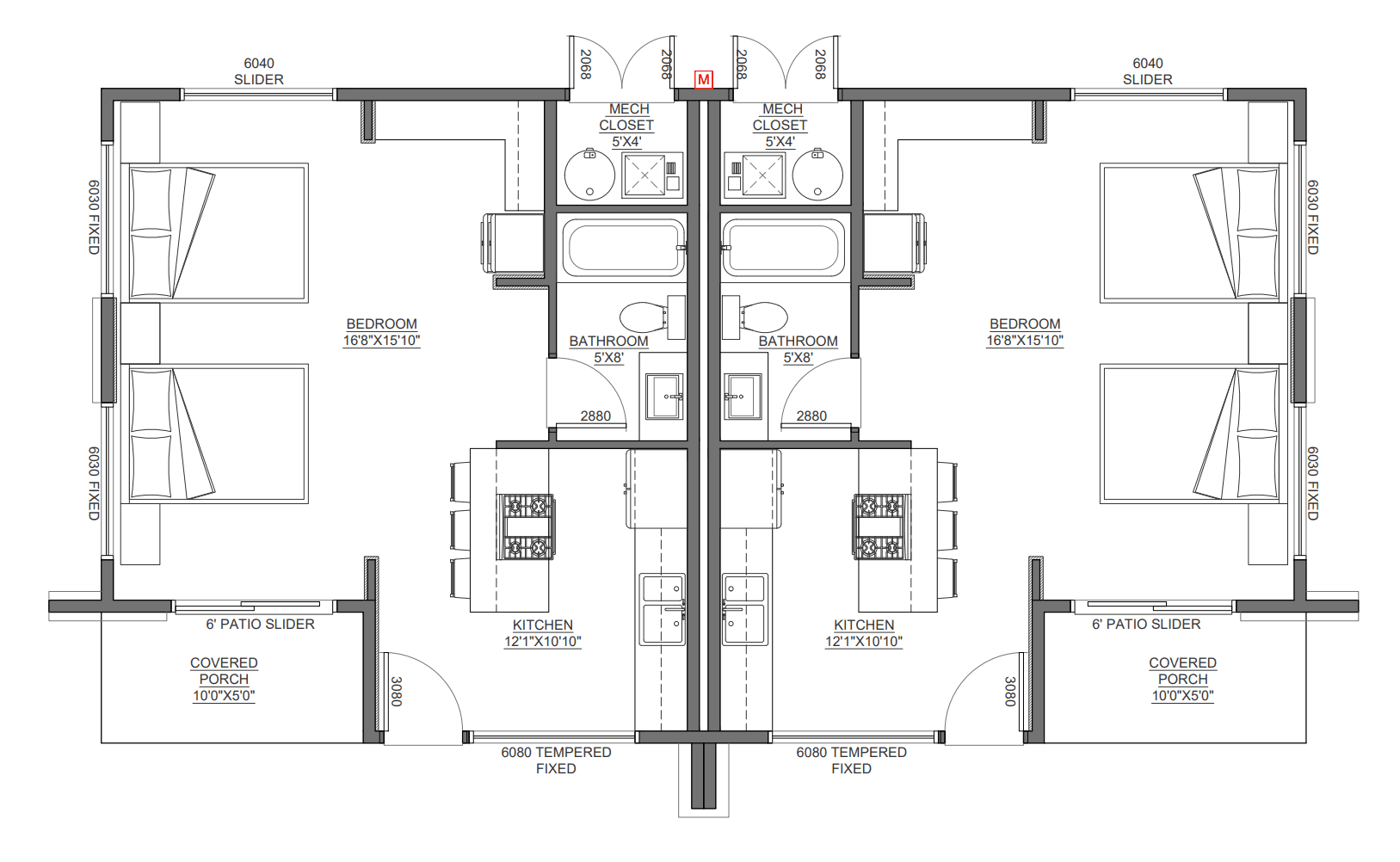 • Duplex configured back-to-back with a shared common wall to centralize plumbing and reduce construction cost