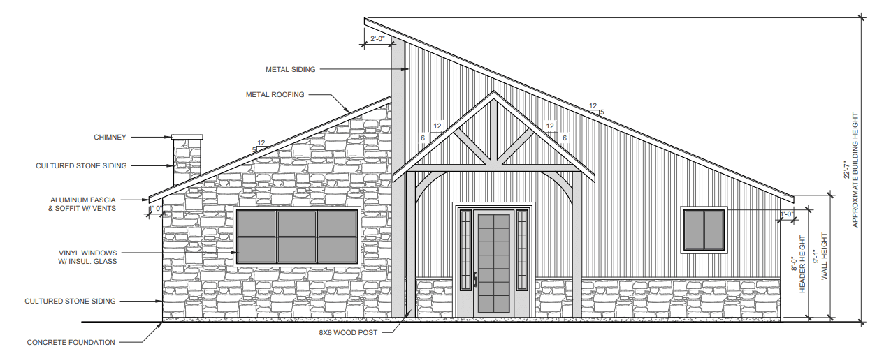 • Exterior elevation set aligned to the selected mountain / cabin / contemporary style direction